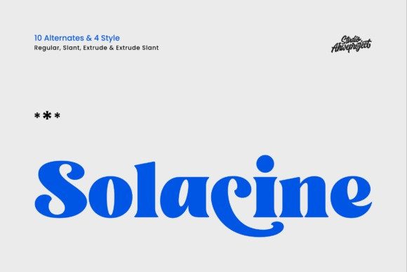 Solacine Font is a bold retro display serif that radiates character with its vibrant curves and confident groove, making it the perfect choice for eye-catching logos, impactful headlines, posters, packaging, and social media visuals.