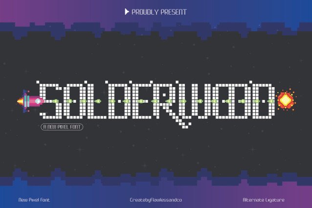 This font is made for personal use. Get the full version of the fonts if you want to use it for commercial purposes by purchasing the licenses here: https://creativemarket.com/Flawlessandco/291442908-Solderwood-Display-Pixel-Font?u=fontlot123