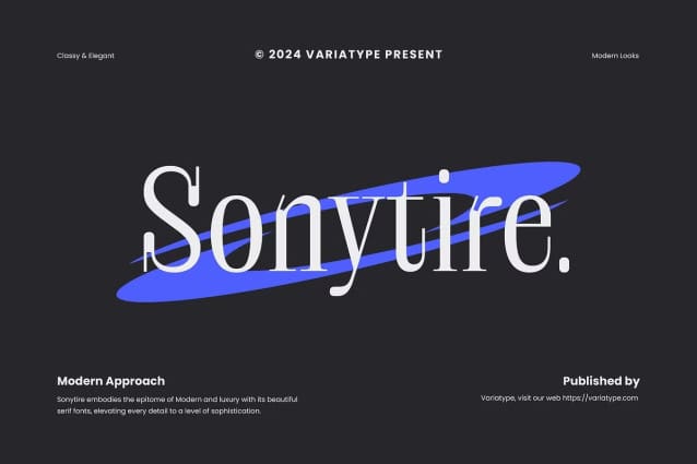 Sonytire Font, a cutting-edge serif font that seamlessly blends contemporary design with classic typographic elements. Characterized by its sleek lines, subtle curves, and innovative use of ink traps, Sonytire redefines the modern serif genre with its unique charm and functionality.