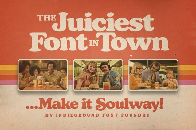 Soulway Font by Indieground This bold, curvy serif font inspired by 70s atmospheres is ideal for giving a retro touch to your digital compositions. Inspired by one of the most iconic typefaces of the last century, this bold display font comes in regular and shadow versions. It can be used to create nostalgic artwork, album covers, posters, and flyers that give off the perfect vintage mood. On top of that, it is ideal for crafting standout, nostalgic pieces for your social media feed. Thanks to its classic curvy nature, this font will let your creativity flow, bringing back those juicy atmospheres we all love!