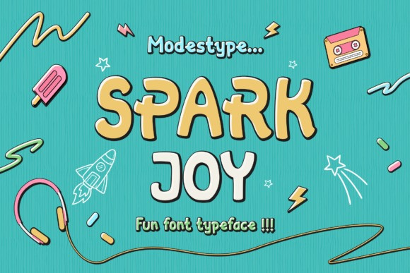 Spark Joy Font is a cool, chunky lettered and fun display font. It works great for cartoon designs, playful creations or pretty much anything related to fun and joy.