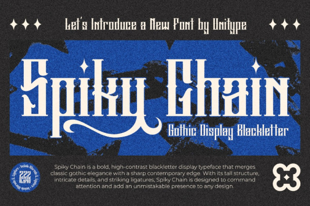 Spiky Chain Font is a bold, high-contrast blackletter display typeface that merges classic gothic elegance with a sharp contemporary edge. With its tall structure, intricate details, and striking ligatures, Spiky Chain is designed to command attention and add an unmistakable presence to any design.