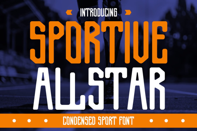 Its dual-tone display preview—contrasting orange and white on deep blue—amplifies visual energy and readability. The set includes uppercase, lowercase, numbers, punctuation, and multilingual support. The mix of straight strokes and unique corner cuts offers rhythm and power, making it suitable for both main titles and supporting taglines. Whether for team logos, gym identity, supplements, or game-day graphics, Sportive Allstar drives your message forward with high-octane confidence.