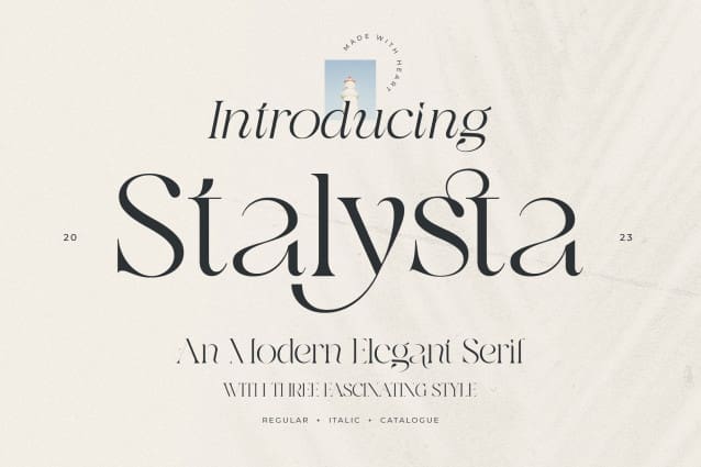 Stalysta Font is an editorial serif font (regular and italic) with smooth curves and elegant look. It’s gorgeous in all caps, but the lowercase letters can really hold their own. Stalysta is perfect for headlines, editorial design, monograms, branding, logos, poster design, and more.