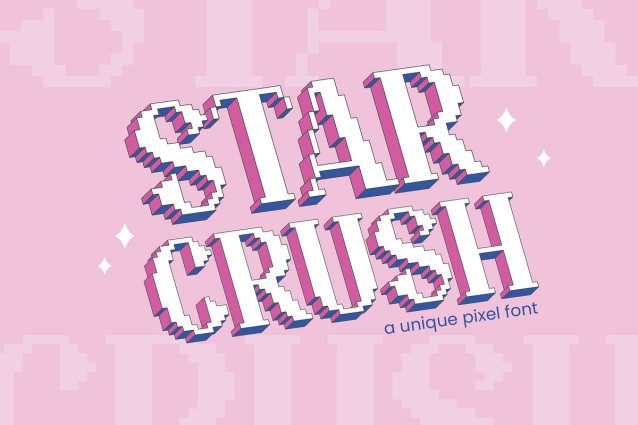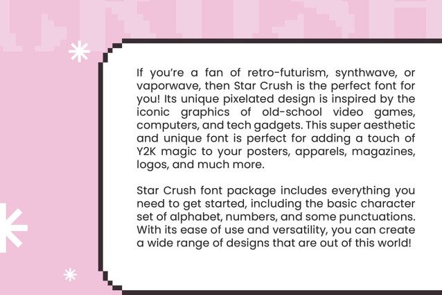 Star Crush Font Its unique pixelated design is inspired by the iconic graphics of old-school video games, computers, and tech gadgets. This super aesthetic and unique font is perfect for adding a touch of Y2K magic to your posters, apparels, magazines, logos, and much more.