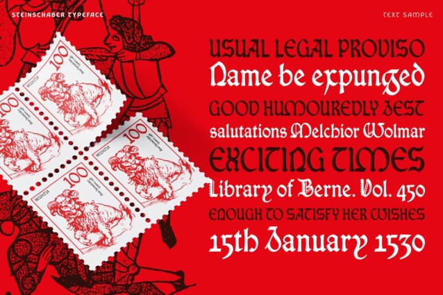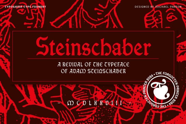 Steinschaber Blackletter Font is a single weight, display typeface based on the blackletter Rotunda style used by the first printer of Geneva. Through its quirky letter forms, pronounced contrast and diagonal axis, it offer a unique style that could be used as a historical artefact or integrated into a more contemporary composition. Through the Opentype features, a secondary, Titling set of capitals letters allows further explorations for setting content. Steinschaber Blackletter includes a full latin character set, a series of typographic fleurons and a range of numerals to choose from. This typeface and the secondary family, Schaberstein, are part of the Forgotten Printer collection that aims to celebrate the work and life of Adam Steinschaber who introduced printing to the city.