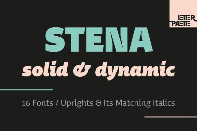 Stena Font Family, is a very functional sans serif typeface with calligraphic feel, especially designed for contemporary typography. This family features deep and sharp ink-traps as part of its design. Thanks to its proportions, solid and balanced forms, combination of straight and curve lines, high x-height and expressive ink-traps, Stena combines readability with a strong personality.