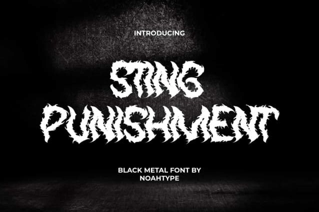 Sting Punishment Font is a egregious black metal font with horror style by NoahType. This font can give a goosebumps feeling to the designs you create. It will be perfect for any designs, such as brand image, custom design, invitation, label, marketing material, menu, poster, printing, product packaging, quotes, signage, website, and many more!