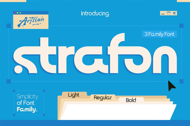 Strafon Font is a clean, modern, and super–versatile display sans serif that instantly gives your design that corporate-but-cool energy. With rounded edges, smooth curves, and a bold futuristic touch, this font family is made to stand out effortlessly. It comes in 3 weights (Light, Regular, Bold)—perfect for creating logos, headlines, branding systems, UI design, and anything that needs a structured yet friendly vibe. Inspired by folder shapes and organized layouts, Strafon brings clarity, style, and personality into one cohesive font family. If you’re aiming for something professional, stylish, and fresh, Strafon is the font that gets the job done.
