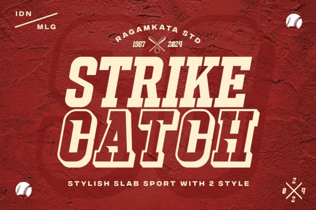 Strike Catch Font, a stylish slab sport with 2 style that combines the power and speed of modern sports with the elegance of classic design. Perfect for sports headlines, logos, branding, and more, Strike Catch features 12 styles: Regular, Italic, Outline, Extrude, Italic Outline, Italic Extrude, Slash, Slash Italic, Slash Outline, Slash Extrude, Slash Italic Outline & Slash Italic Extrude. Its smooth curves, clear alternates, and modern aesthetics ensure readability and a dynamic presence. Ada juga karakter slash yang menambah variasi dan kreativitas dalam desain Anda.