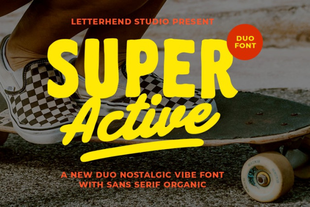 Super Active Font Duo is a bold and playful duo font inspired by nostalgic vibes and youthful energy. Featuring an organic sans serif paired with a dynamic script, this font duo is perfect for branding, poster designs, apparel, social media graphics, and any project that calls for a fun and energetic look. With its retro-modern aesthetic and sporty edge, Super Active brings a lively character to your creative work.