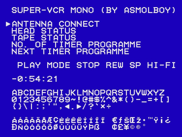 Super-VCR Mono Font by ASmolBoy. A pixelated font based on the on-screen displays of VHS players/VCR’s. Font size of 12px (or multiple of) is recommended to get nice square pixels. No antialising. Includes support for accented, currency, and other miscellaneous characters.