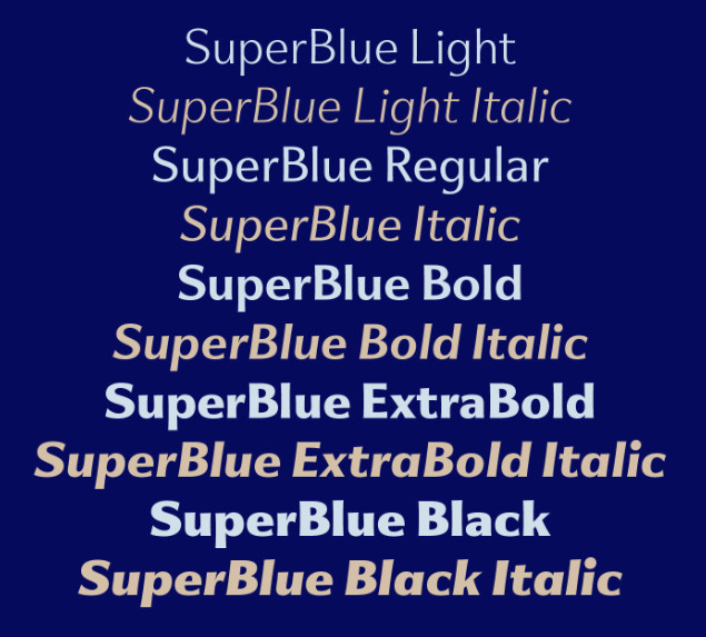 Say hello to, SuperBlue Font, is a casual, cheerful sans serif family designed by Seán Donohoe, a Danish type designer and sign painter. Seán crafted the first version of the family during his time in the TypeMedia master’s program in type design at the Royal School of Art (KABK) in The Hague. While making initial sketches, he took advantage of his sign-painting skills, using two flat brushes to define SuperBlue’s basic forms.