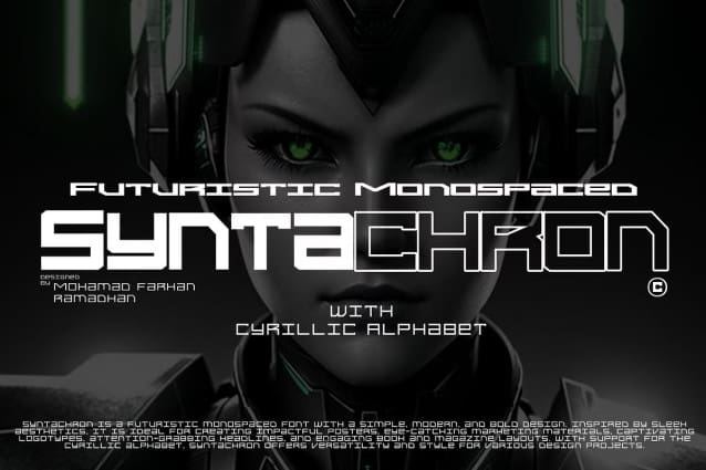 Syntachron Futuristic Font is a futuristic monospaced typeface that combines simplicity, modernity, and boldness. Designed for versatility, it boasts 12 variable styles that adapt to various design needs. With its sleek Cyrillic alphabet, Syntachron Futuristic is perfect for creating captivating posters, impactful marketing materials, captivating logos, eye-catching headlines, and engaging book and magazine layouts. Whether you’re seeking a contemporary look or a cutting-edge aesthetic, it is the ideal choice for a wide range of design applications.