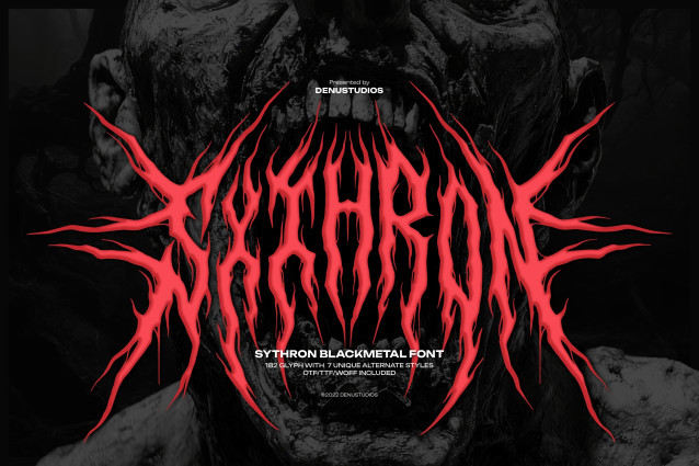 Sythorn Font | Black Metal Font, from Denustudios, suitable for any projects such as: logos, branding projects, homeware designs, product packaging, mugs, quotes, posters, shopping bags, t-shirts, book covers, name card, invitation cards, greeting cards, label, photography, watermark, special events, and all your other lovely projects that need a Black Metal taste.