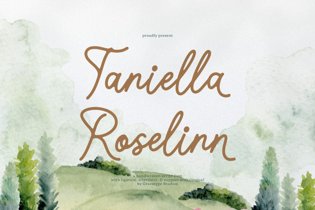 Taniella Roselinn Handwriting Font | Handwritten Script, from Gracetypestudio, suitable for any projects such as: logos, branding projects, homeware designs, product packaging, mugs, quotes, posters, shopping bags, t-shirts, book covers, name card, invitation cards, greeting cards, label, photography, watermark, special events, and all your other lovely projects that need a Script taste.
