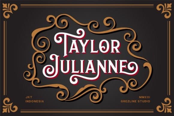 Taylor Julianne Font is a bold serif font with vintage charm. This font was created to give your headlines and logotype projects a strong and confident touch. Taylor Julianne font is also usable in a wide range of works such as logos, covers, posters, quotes, product packaging, merchandise, social media, and much more!