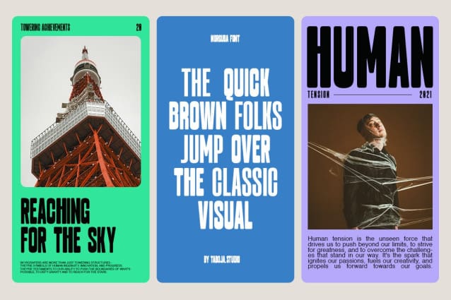 Whether you’re aiming for a relaxed and sensuous vibe or seeking a more versatile and dynamic look, Norguba has got you covered. It’s perfect for brand identities with heart, packaging, and genuine, effortless messaging. Posters, billboards and motion graphics that fly off the screen.