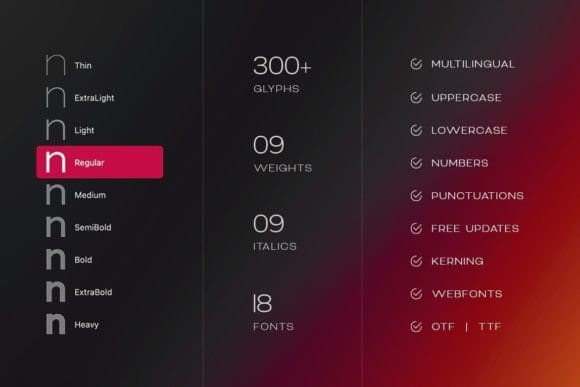 Techno Font Family a sophisticated sans-serif font family meticulously crafted to enhance your design projects with its modern aesthetic and minimalist sensibility. With 9 meticulously designed weights ranging from the delicate Thin to the commanding Heavy – alongside their corresponding italics, Techno Nue offers a total of 18 fonts to meet all your design needs.
