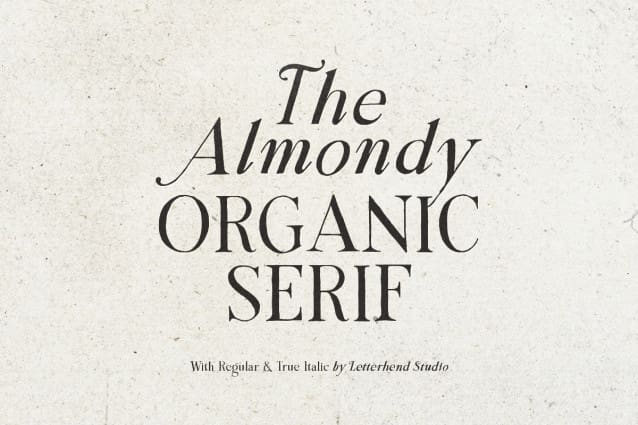 The Almondy Organic Font – An organic serif with stylish looks. It comes with true italic version. Perfectly to be applied to the other various formal forms such as invitations, labels, logos, magazines, books, greeting / wedding cards, packaging, fashion, make up, stationery, novels, labels or any type of advertising purpose.