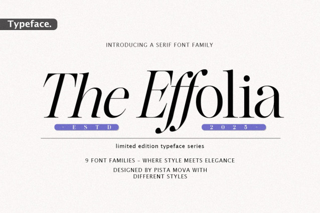 Experience the charm of timeless elegance with The Effolia, a carefully crafted serif typeface that blends classic charm with contemporary style. Its high-contrast strokes and graceful curves create a visual symphony that captivates the eye and elevates any design. Whether you’re creating a sophisticated editorial layout, a striking brand identity, or an engaging website, The Effolia’s versatility and refined beauty will make your work stand out.