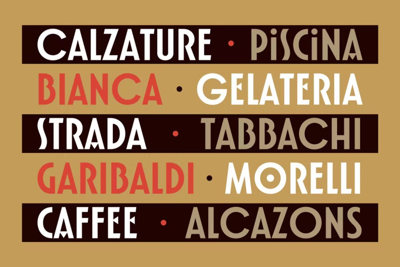 The Hotel Grande Font is inspired by art deco and Italian brands. This display font features clean and simple letterforms that look modern while having a retro and art-deco flair. Fiorent Deco is a great choice for titles, logos and branding. This is an all-caps display font with some cool alternatives, including an alternate S that instantly gives your copy a retro-deco look. The poster was inspired by Italian cuisine and design. This range is ideal for food packaging and branding, as well as restaurant or cafe menus and branding.