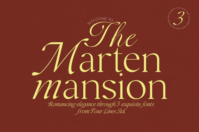 The Marten Mansion Font, a font family that seamlessly integrates serif and script styles. Available in three variations—Regular, Italic, and Script—this font family combines the elegance of serif typography with the refined beauty of calligraphy.