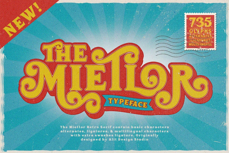 The Mietlor Serif Font by alitdesign. The Mietlor Typeface is inspired by stylish designs from the 80s to 90s. At that time the font style like “The Mietlor Typeface” had a firm and trendy impression. The Mietlor Typeface has a wide selection of alternative characters and swashes that make it easy to create bold retro-style designs.