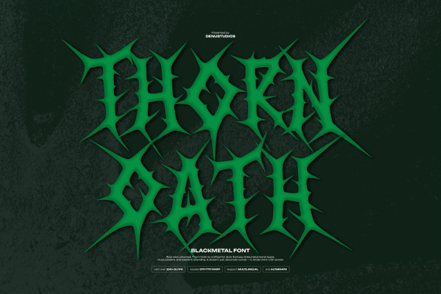 Thorn Oath Font | Black Metal Font, from Denustudios, suitable for any projects such as: logos, branding projects, homeware designs, product packaging, mugs, quotes, posters, shopping bags, t-shirts, book covers, name card, invitation cards, greeting cards, label, photography, watermark, special events, and all your other lovely projects that need a Black Metal Typeface taste.