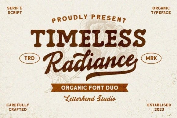 Timeless Radiance Font is an organic font duo consist of a bold script paired with a slab serif with a touch of classic look and feel. This type of font perfectly made to be applied especially in logo, headline, signage and the other various formal forms such as invitations, labels, logos, magazines, books, greeting / wedding cards, packaging, fashion, make up, stationery, novels, labels or any type of advertising purpose.