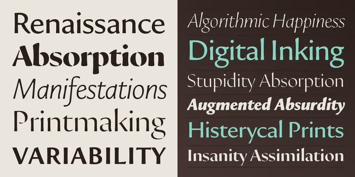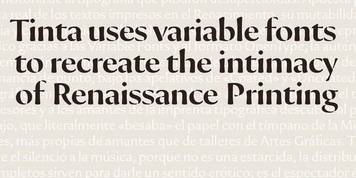 The Tinta typeface is a rebellion against sterility and cold perfection. In a time dominated by supersharp offset printing and screen typography, Tipografies embarks on a search of lost warmth. The goal is to recreate the mood of Renaissance printmaking. Tinta utilizes variable font technology to bring back the vulnerable quality of letterforms.