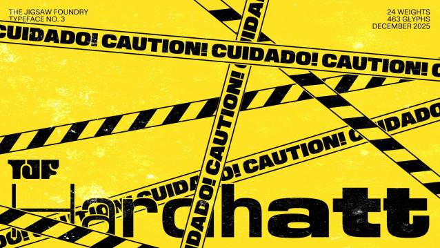 TJF Hardhatt Font is a modern reinterpretation of Aldo Novarese’s Eurostile (1962), famous for its use in various forms of science fiction media. With a much needed expanded weight range that now goes way chunkier than the original’s rather meager bold, and a width axis that makes good use of your heading space, Hardhatt is ready for anything and is no laughing matter.