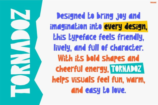 In the end, Kids Font Tornadoz helps your designs feel happier, louder, and more memorable. It turns simple words into fun visual moments. So, if you want your message to feel friendly, bold, and full of imagination, this font is ready to deliver. Add Tornadoz to your collection today and let every letter tell a joyful story.