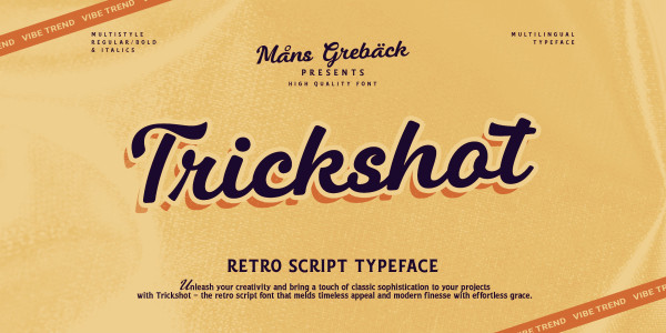 Trickshot Retro Font, is a handmade script font that evokes a sense of rustic charm and enthusiasm. Its expressive style makes it a good choice for designs that require a strong visual impact, such as a sports team logo.