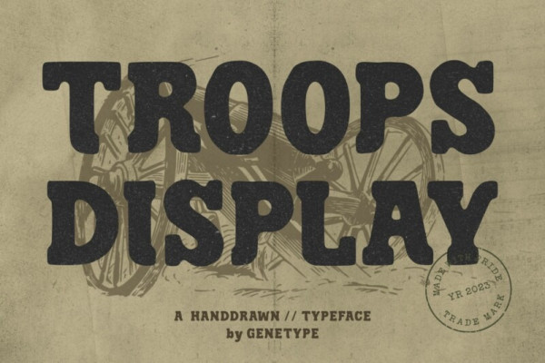 Troops Display Font : Where Vintage Meets Bold! Unveil the power of “Troops Display” – a font that seamlessly fuses vintage aesthetics with a bold, modern twist. Inspired by the rugged charm of the past, this slab serif typeface exudes strength and character in every letterform. From striking headlines to impactful branding, “TroopsDisplay” commands attention with its rough lines and distinctive serifs. Whether you’re reviving a classic look or adding a touch of timeless flair, “TroopsDisplay” is your go-to choice for designs that stand the test of time. Embrace the heritage of typography – explore “TroopsDisplay” and let your creativity make a lasting mark!