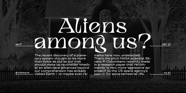 The TT Alientz family consists of 3 fonts: grotesque, serif and variable font. Each font contains more than 470 glyphs. In addition to broad language support (including Cyrillic), the typeface has stylish ligatures, contextual alternates, and old-style figures. Variability in the typeface affects the changes in the overall style of the font—moving the slider to adjust the variable axis, you can go from a laconic grotesque to an extreme serif.