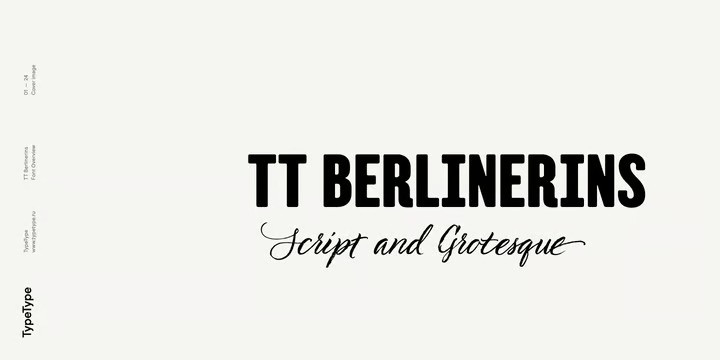 TT Berlinerins Sans Serif Font is a contrast pair of typefaces which is basically our tribute to Berlin. Just like in the city itself where historicity and modernity are intertwined, the elegant script in our font family symbolizes the modern Berlin, and the grotesque inspired by the wood-type poster types of the first third of the 20th century is responsible for the historic component of the city. The idea of this project emerged in the beginning of 2016 when we’ve met Evgenia Pestova, a calligrapher from Berlin, who shared the contemporary perspective on calligraphy and the city impressions with us. The wood-type grotesque appeared later, after our another colleague had visited Berlin and told us her fascinating story about the things she had seen. The city is full of contrasts—it is very modern and very vintage at the same time. The photographs and the impressions from the trip have also become the basis of our project. That is how we’ve added a little of old Berlins roughness and inhomogeneity. TT Berlinerins Script contains 998 glyphs, including more than 240 swashes for which we’ve written a special feature. We’ve also drawn a large number of ligatures for TT Berlinerins Script and integrated wide support of OpenType features: ordn, frac, case, sups, sinf, numr, dnom, tnum, pnum, calt, liga. TT Berlinerins Grotesk consists of uppercase letters, includes a set of unusual ligatures and wide support of OpenType features: ordn, frac, sups, sinf, numr, dnom, tnum, pnum, liga, salt and two stylistic sets ss01, ss02 for the ampersand.
