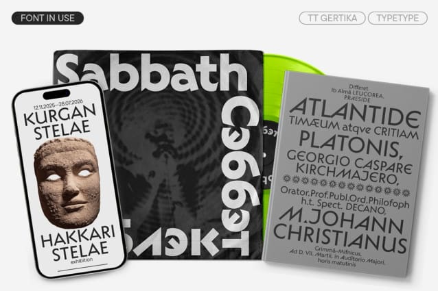 TT Gertika is well-suited for accent placement and shines best in large point sizes. However, it works well enough in small text blocks as well. This font is an excellent choice for covers of books and magazines dedicated to art. It can effortlessly adorn the exhibition environment and blend harmoniously with brand identities inspired by folklore and works from the primitivist genre.