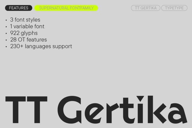 Due to stylistic sets, the mood and visual features of the font may transform dramatically: you can make it look more strict and dynamic or, in contrast, rounded and fluid. In addition, the typeface includes a variable font with a weight variation axis. This makes the mood of TT Gertika even easier to adapt to your needs.
