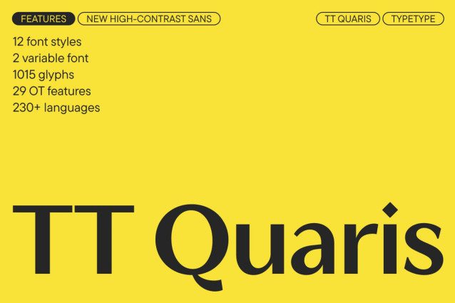 TT Quaris Font is an exquisite and modern high-contrast sans. Before developing this typeface, we carried out an in-depth study of high-contrast sans archetypes. Based on our findings, we formulated the key parameters and stylistic features of the future font, after which we began its development. The creation of the family took over two years and 2,500 hours of painstaking work. The result is a graceful, yet fresh and unconventional typeface. Its design features modern elements: a lack of stem flaring, high contrast, and a static structure.