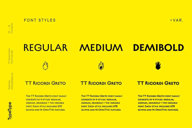 The TT Ricordi Greto font family consists of 4 styles: regular, medium, demibold + the variable font. Each style includes 678 glyphs and 14 OpenType features. In addition to wide language support (extended Latin and basic Cyrillic), each style has two sets of figures and currencies (proportional and tabular), a set of arrows alternative versions of the letter M (flared and straight versions) and the letter Ф (round and oval) and the same a set of icons, margin markers and catchwords.