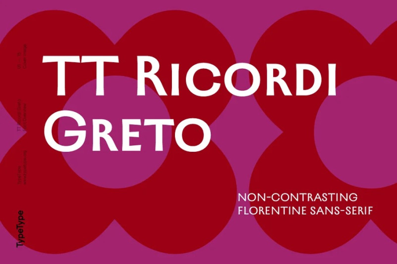 TT Ricordi Greto is a non-contrasting Florentine sans-serif with dynamic proportions and a hint on what would be serifs. The main features of the typeface are the closed aperture, dynamic proportions, and the combination of historical forms with modern visual solutions, flowing terminals with curling dash ends and flared ends, and subtle serifs that hint at the historical material.