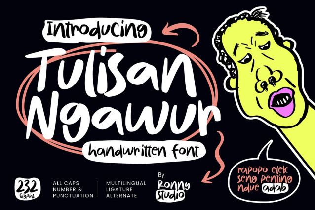 Tulisan Ngawur Font, a playful and quirky handwritten font designed to infuse your creative projects with a fun and casual vibe. With its lively letterforms and organic flow, Tulisan Ngawur is perfect for posters, merchandise, social media content, branding, and any design project that calls for a relaxed and creative touch.