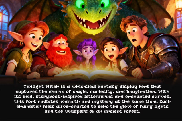 Twilight Witch Font is a fantasy display typeface designed with organic, hand-drawn contours that evoke the charm of classic storybook lettering. Its bold weight and slightly irregular shapes create a lively rhythm, adding depth and personality to titles, headers, posters, children’s books, game interfaces, and cinematic branding. The font blends playful curves with an enchanted visual tone, making it ideal for projects that aim to capture a sense of magic, adventure, and mystical atmosphere. Uppercase and lowercase sets are crafted for consistency while maintaining the whimsical character that defines the font’s identity.