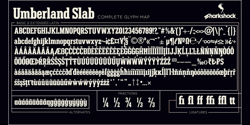Umberland Slab Font is an attractive family available in 3 different weights with italics. There’s a particular emphasis on simple geometric shapes and the way they interact with tall vertical strokes. Smooth curves and sharp angles blend together in a pleasing symmetry. Stroke widths are given variable degrees of contrast but serifs are consistent and heavy handed. Spacing is on the tight side with some lowercase pairs quite snug against each other. Umberland Slab would work well in small blocks of text, corporate logos, menus, or signage. This family is equipped with European accents/diacritics for international support, fractions, alternates, and ligatures.