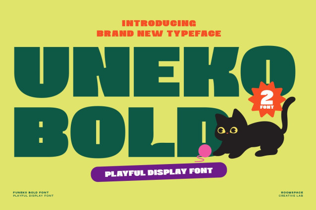 Uneko Bold Font is a playful display typeface with chunky shapes and a cute cartoon personality. Designed for children’s branding, colorful packaging, posters, and character-based design, this font brings joy and bold expression to every project. This set includes 2 styles, offering flexibility for titles, illustrations, and fun storytelling visuals.