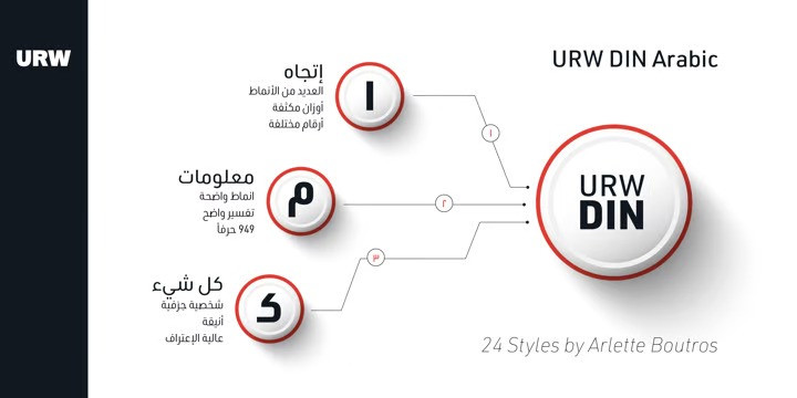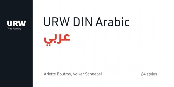 The digital outline fonts, DIN 1451 Fette Engschrift and Fette Mittelschrift were created by URW in 1984 and are the basis for all DIN font families. Both typefaces were designed for the URW SIGNUS system and were mainly used for the production of traffic signs. They have since become so popular that we have developed a complete Arabic DIN family together with Boutros Fonts. The Arabic characters have been designed to harmonize with our Latin URW DIN and come in 24 individual styles, which consist of 8 weights from Thin to Black and three different widths: Regular, Semi Condensed, and Condensed.