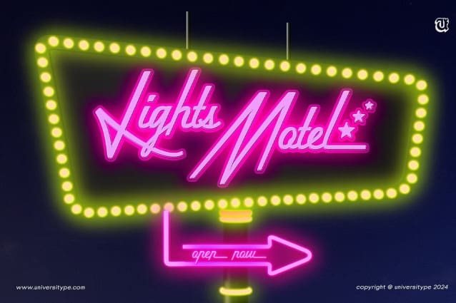 This font is used only for demos (Demo license). If you want to use this font for commercial use please contact: https://creativemarket.com/universitype/283375444-UT-Lights-Inn-A-Retro-Script?u=fontlot123