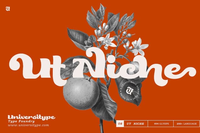 With 501 glyphs, including an array of stylish alternates and ligatures, UT Niche offers endless creative possibilities. Its bold strokes and swashes infuse personality into each character, making every word stand out with warmth and authenticity.