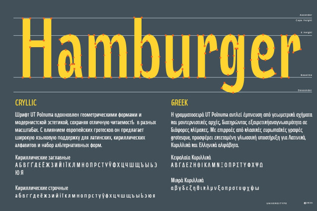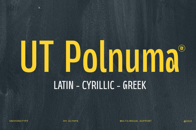 UT Polnuma Font, a contemporary sans-serif typeface designed for clarity and versatility. With support for Latin, Cyrillic, and Greek alphabets. UT Polnuma draws inspiration from modern geometric typefaces, aiming to strike a balance between classic simplicity and contemporary design trends. The “unfinished” design approach adds a dynamic and creative touch, making it appealing for modern branding and editorial projects.